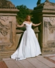 Off-the-shoulder draped satin ballgown featuring a sculpted sweetheart neckline and softly structured bodice. Precision pleating defines the waist before transitioning into a subtle basque detail that enhances the silhouette. The voluminous skirt falls into fluid, luminous folds with discreet pockets and an extended train, embodying modern royalty with refined couture simplicity.